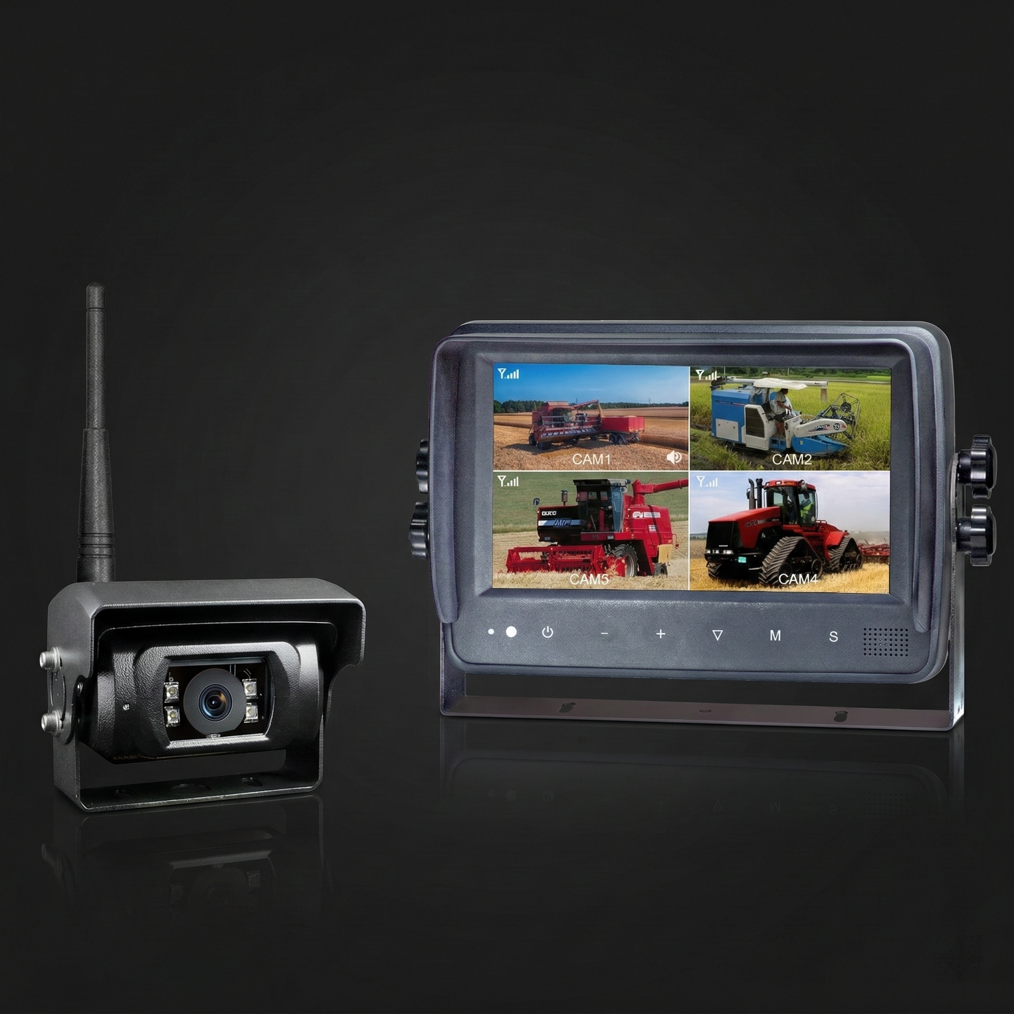 What the kit includes: Wireless (2.4gHz) 7-inch HD touchscreen with remote control, for 10-32 volts Wireless (2.4gHz) backup camera with automatic protective cover, heating, and IR night vision.